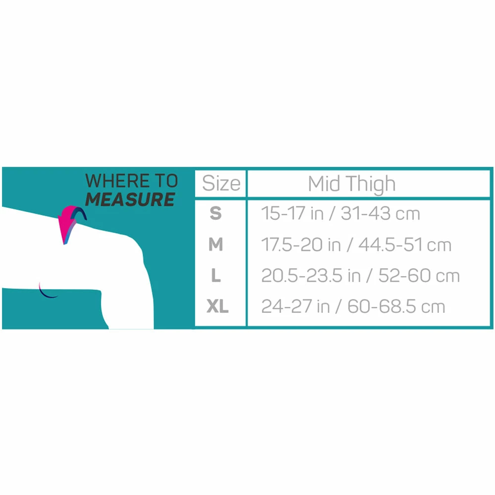 The OS 1st QS4 Thigh Support provides the graduated compression athletes need to combat nagging injuries and get back to training. The Compression Zone Technologyยฎ helps relieve pain associated with Iliotibial Band Syndrome, hamstring weakness, quad strains, and helps deal with leg fatigue, promoting quicker recovery. This latex free sleeve is sleek enough to wear under clothing and is perfect for packing away in a travel or gym bag.