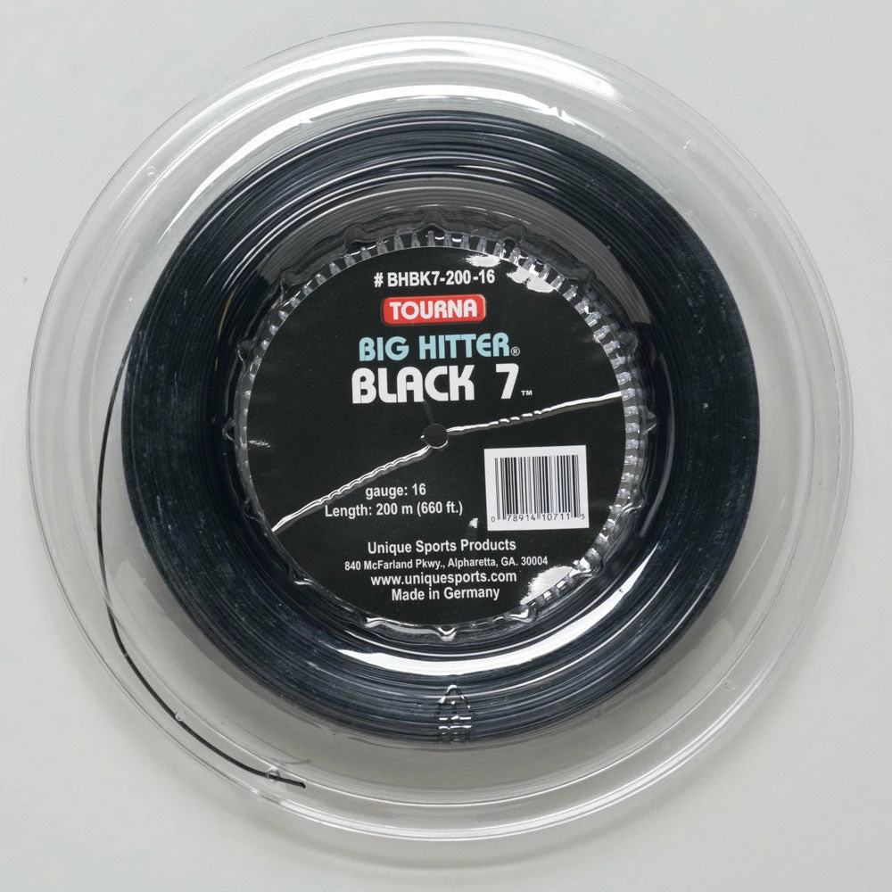 Polyester. Providing control and outstanding spin potential with seven sharp edges that bite into the ball, Big Hitter Black 7 is a great choice for strong players looking for maximum spin potential with excellent control and tension maintenance. Specially blended polyester and polyether materials are able to hold tension better than standard polyester strings. This polyester is ideal for persistent string smashers who crave more control and spin potential.