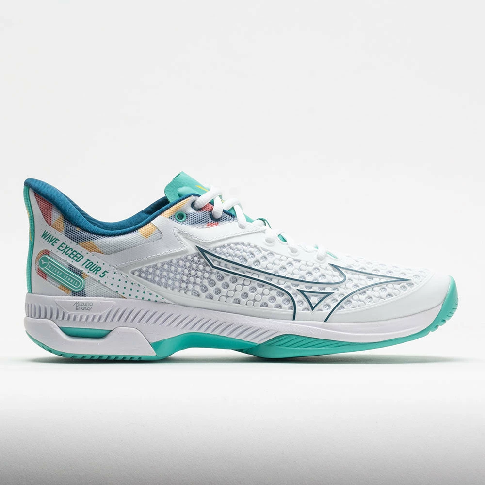 Faster, lighter and more flexible than before, the Mizuno Wave Exceed Tour 5 is for advanced players seeking explosive on-court performance. MIZUNO ENERZY foam in the midsole delivers quicker turns, starts and stops for ultimate energy return. The bootie construction and a remodeled 3D-SOLID upper design add flexibility and comfort, allowing the foot to integrate with the shoe no matter how intense the movements. MIZUNO WAVE Technology increases ankle stability and shock re-distribution while the DuRubber outsole provides the durability and longevity top players demand.