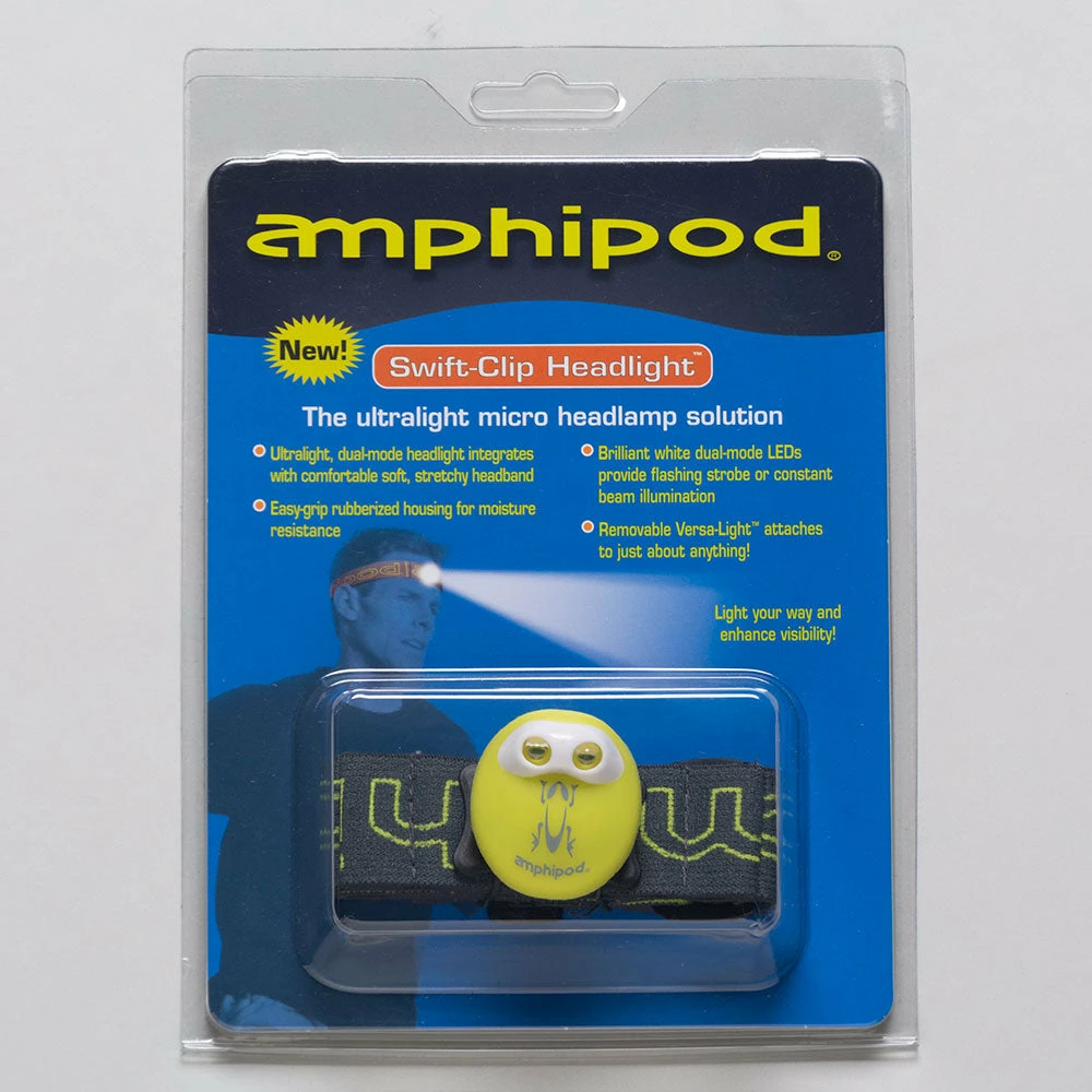 The amphipod Swift-Clip Headlight™ offers ultra-bright light for running at night or in the early morning. The soft, flexible and adjustable headband stays in place while running. This convenient headlight also includes dual mode white LEDs with a flashing strobe and constant beam front illumination mode.
