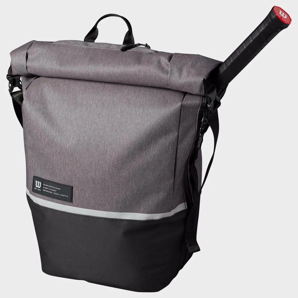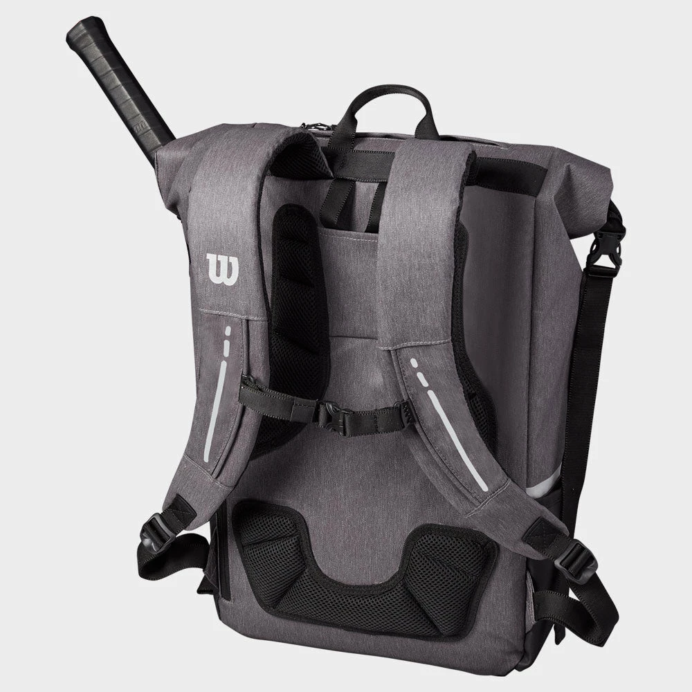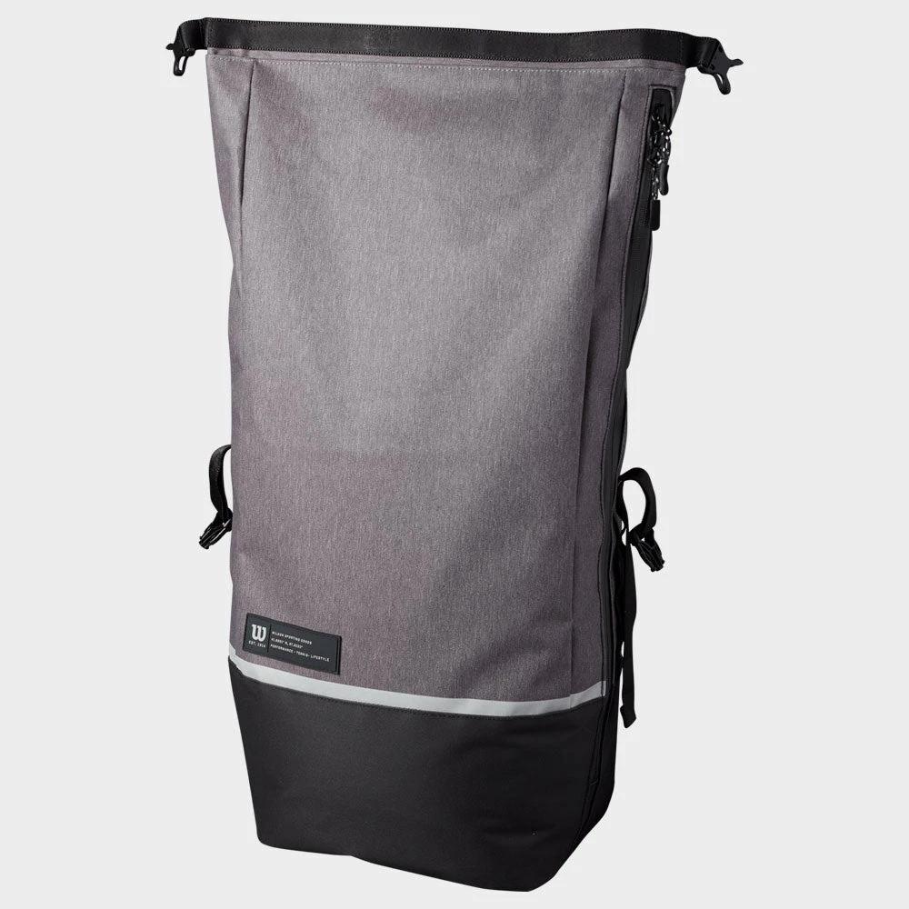 The Wilson Roll Top Backpack is a trendy lifestyle option with attractive and flexible features for tennis players. The main compartment can be rolled up or out depending on the contents of the bag, meeting your needs for the match. The internal padded tablet sleeve and laptop compartment protect your valuables while traveling to and from the court. Find a home for your shoes in the removable zippered shoe pouch. The hidden plastic fence clip allows the bag to hand during play. Enjoy comfortable carrying with the ergonomic backpack straps with an adjustable sternum strap to prevent slippage.