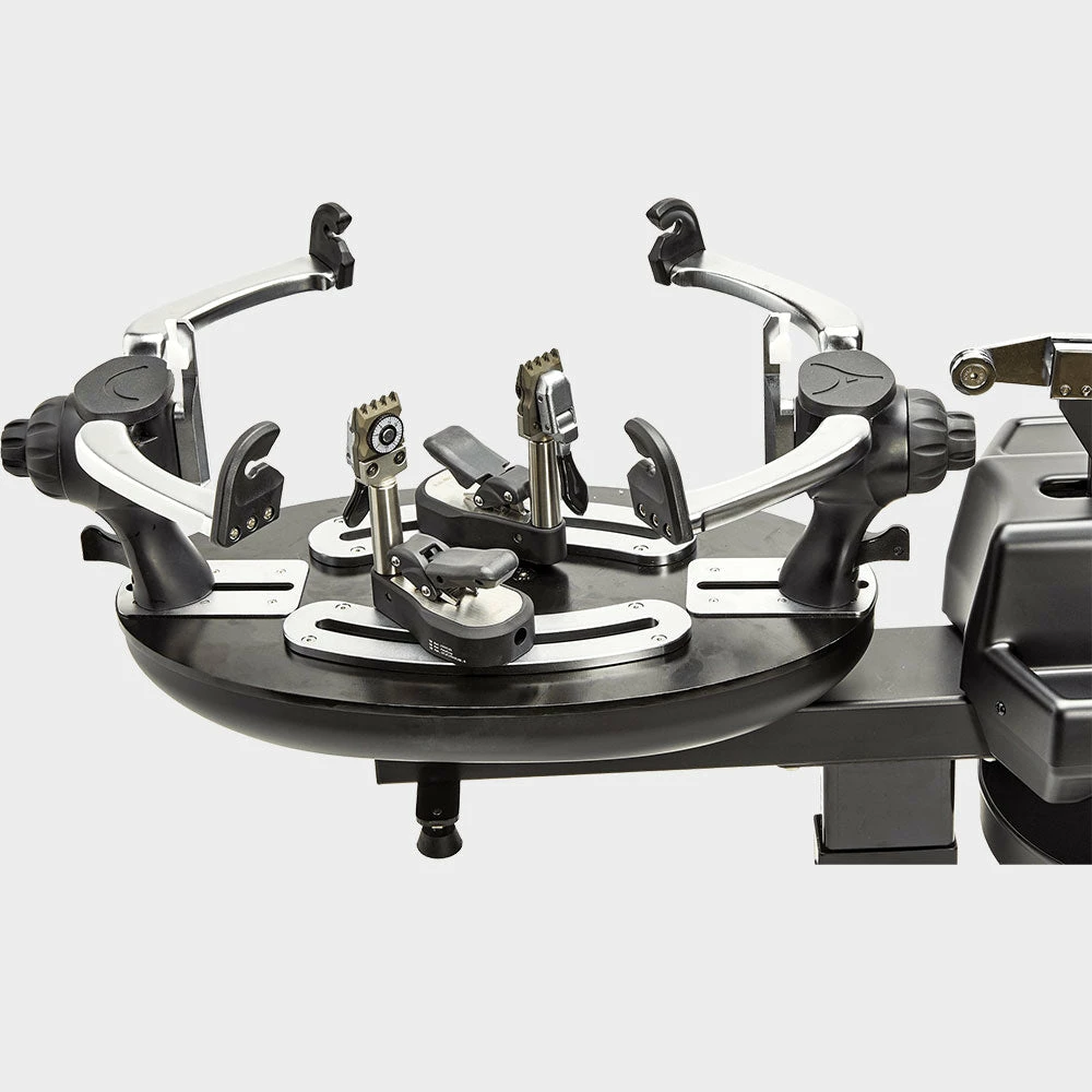 - 6 Point Self Leveling Mount, One Knob Adjustable, and Ergonomic 360 degree base make this a breeze to string on. The towers are strategically laid back to maximize the working space underneath the racquet, something youll enjoy while stringing many racquets.