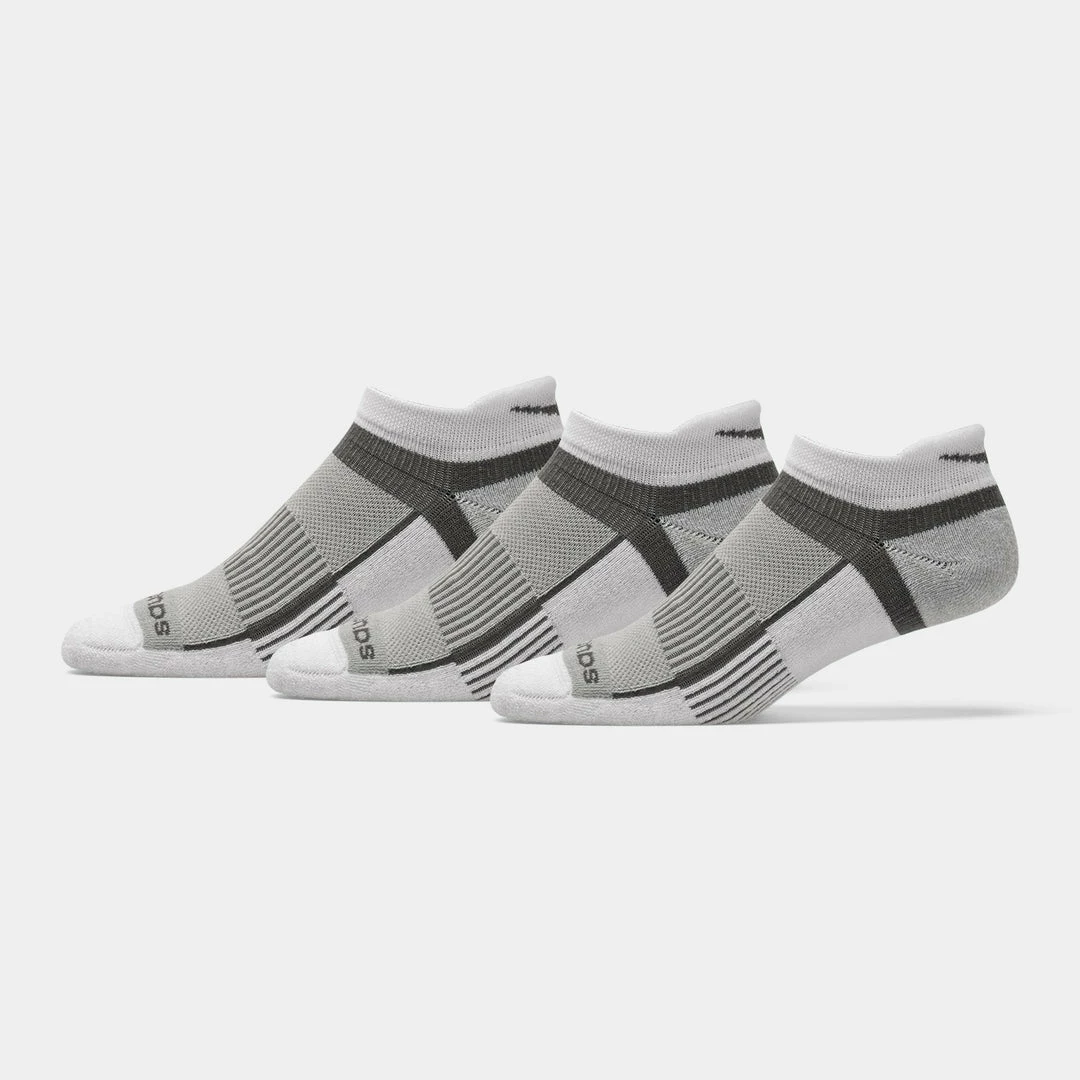 The Saucony Inferno No Show Tab 3 pack socks are here to give runners and athletes superior comfort and cushion during their most intense training and performances. With the Built-in RunDryยฎ Pro moisture management system, airmesh ventilation, and seamless toe, feet stay cool, dry, and free from blisters. The Y-heel and targeted compression at the ankle, these socks fit securely in place during activities.