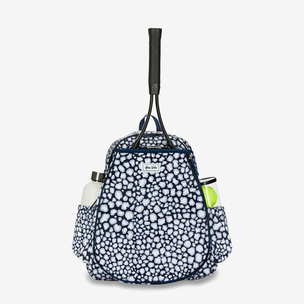 A racquet bag thats means business, just like you! The new Ame and Lulu Game On Tennis Backpack takes over for the tennis bags of old, providing fashionable ladies with a stylish bag to take to and from the courts. This backpack features an exterior zippered pocket that can fit up to two tennis racquets as well as exterior side pockets for a water bottle or cans of tennis balls. Inside, ladies will find slip pockets and zippered pockets for organizing small essentials. Pick your favorite pattern from a collection of trendy designs.