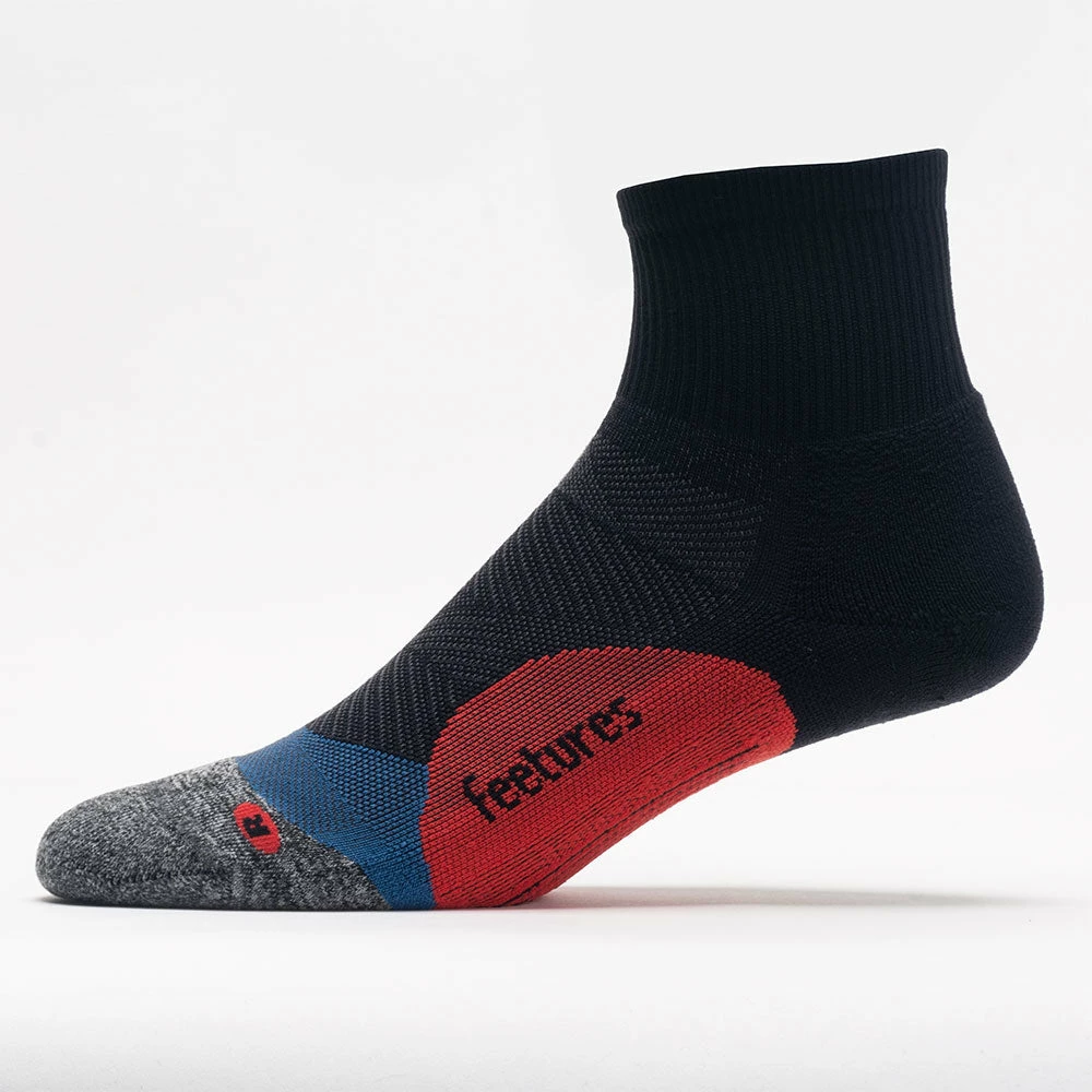 The Feetures Elite Max Cushion Quarter socks make all the difference when performance is your focus. The soft, iWickยฎ enhanced fabric wraps around the foot for a luxurious feel while preventing excess moisture from building up. An anatomical design provides an improved fit to deliver maximum comfort and protection by eliminating blisters.