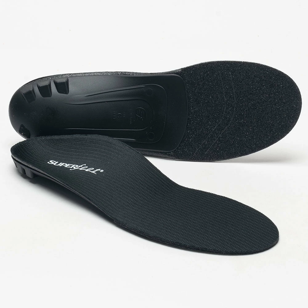 Superfeet Black is the ideal insert for lower arched feet, yet easily accommodates all arch types. This thin, ultra-light design makes it the recommended choice for support and comfort without high volume. Recommended for minimalist shoes and dress, casual, cleated and cycling footwear.