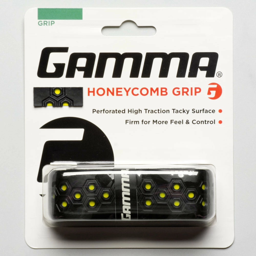The Gamma Honeycomb Replacement Grip is constructed with an extra tacky and firm surface that provides high traction for maximum grip feedback and control. A perforated honeycomb surface absorbs moisture to provide a sure firm non-slip grip.