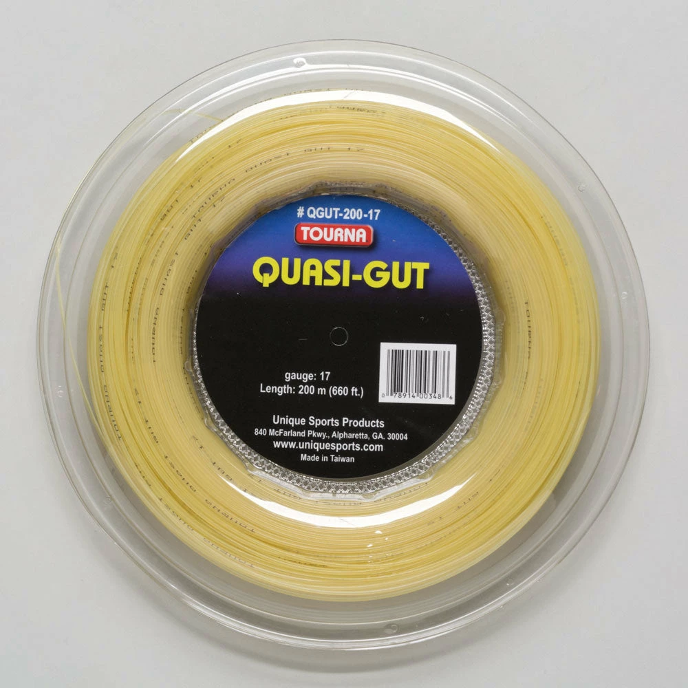Multifilament Synthetic. Quasi-Gut 17 660′ reel tennis string is constructed with thousands of microfibers. Each is impregnated and contained in a premium thermo-elastic polyurethane resin. These tightly wound microfibers deliver a natural gut-like feel and playabilitywithout the high cost of gut. The premium PU resin greatly increases durability and weather shielding as compared to natural gut.